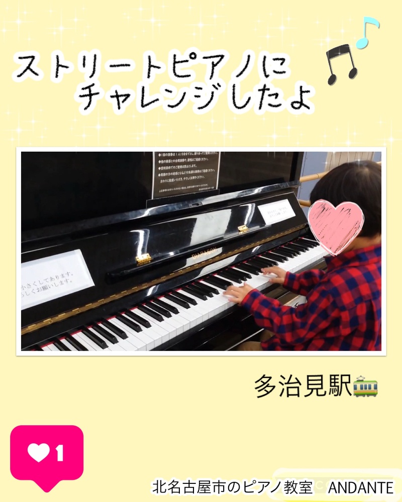 多治見駅のストリートピアノに行ってきました〜と動画をいただきました!今年、初めて発表会にもチャレンジしてくれる生徒さんです❣️発表会曲なのでここではまだ非公開にしておきますね🎶電車も大好きだそうで、また電車に乗って行けるところに弾きに行ってみようかなぁと言っていました☺️🚃また行ったら教えてくださいね〜💕🎶