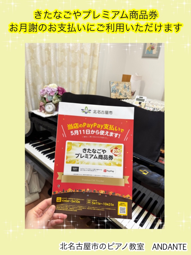 きたなごやプレミアム商品券当教室でもご利用いただけます💁♀️(5/11〜)こちらは北名古屋市民の方限定の商品券となります。商品券は抽選になるので事前申し込みが必要です。今月の広報にも載っていましたね!事業者向けの案内が届いておりますので生徒の皆さまにもお知らせいたします❣️わたしも一市民として申し込みしたけど当たるかな🤭楽しみに結果を待ちます。#PayPay#きたなごやプレミアム商品券 #北名古屋市ピアノ教室 #北名古屋市習い事#北名古屋市